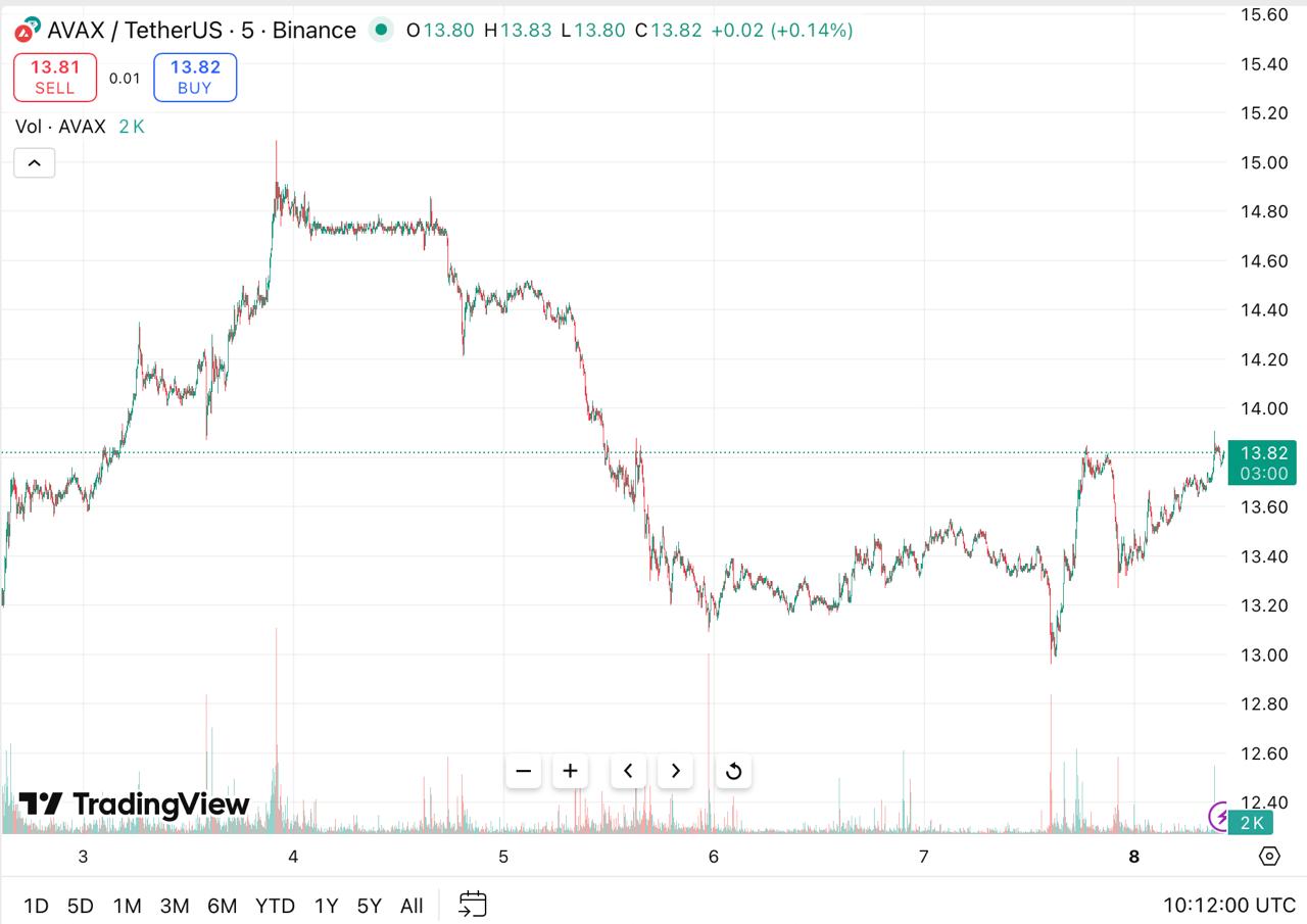 Over the past five days, Avalanche has experienced a pronounced decline from the mid-$14 range, breaking key intraday supports before stabilizing near $13.00. After forming a rounded bottom structure on the 6th, AVAX began a gradual recovery, supported by rising volume and a sequence of higher lows that signal improving short-term sentiment. The latest push back toward $13.80 highlights strengthening bullish momentum, though the asset still faces overhead resistance near $14.00, which remains the level to watch for a potential continuation higher.