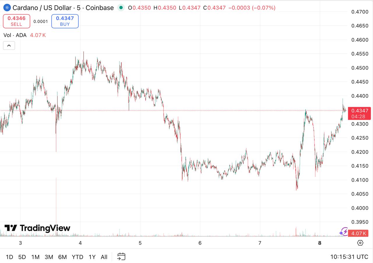Over the past five days, Cardano has moved from a steady decline into a pronounced sell-off on the 5th, breaking below the $0.42 level before stabilizing. Following this capitulation move, ADA formed a broad base and began climbing steadily, supported by rising volume and a clear pattern of higher lows. The sharp recovery into the $0.43–$0.44 region signals improving short-term sentiment, though the chart shows ADA still contending with overhead resistance that will determine whether this rebound evolves into a sustained trend.