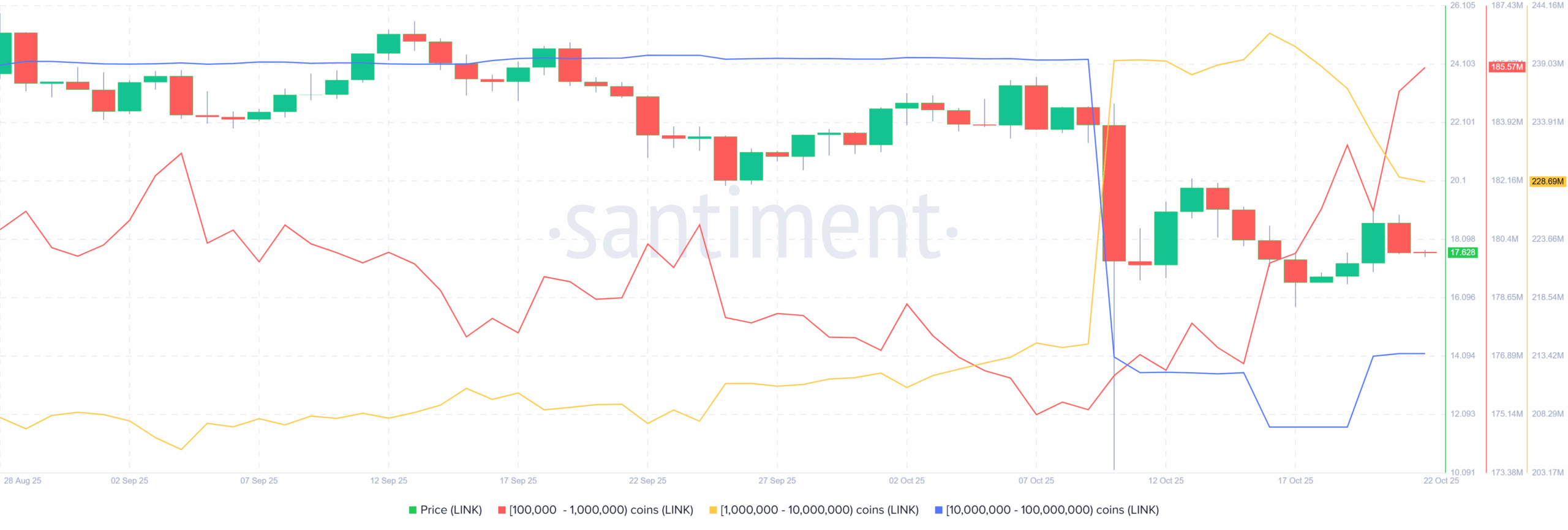 Santiment’s latest whale behavior report supports this view, showing that the first cohort of large wallets took advantage of the recent market dip to buy LINK at lower levels, while a smaller group capitulated during the same period. The result is a concentration of holdings among stronger hands, which historically precedes upward price movements.