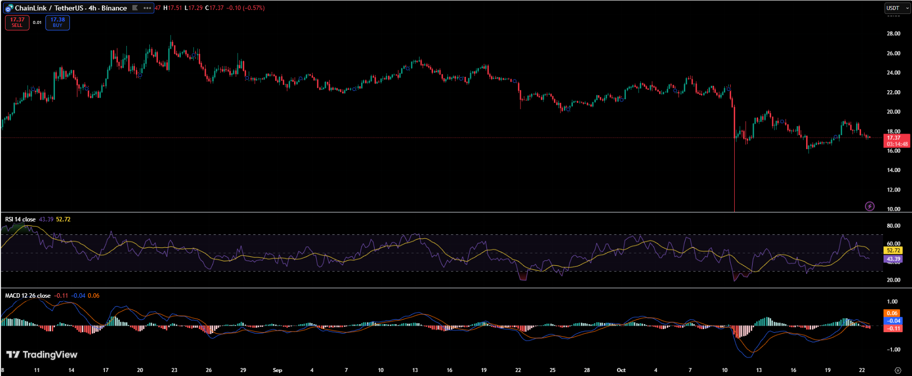 On the technical side, Chainlink currently trades around $17.4, maintaining stability after its early October pullback. The Relative Strength Index (RSI) sits at 52, suggesting balanced momentum, while the MACD is approaching a neutral crossover that could turn bullish with a breakout above $18. If buyers maintain control, LINK could retest resistance in the $20–$22 zone in the near term.