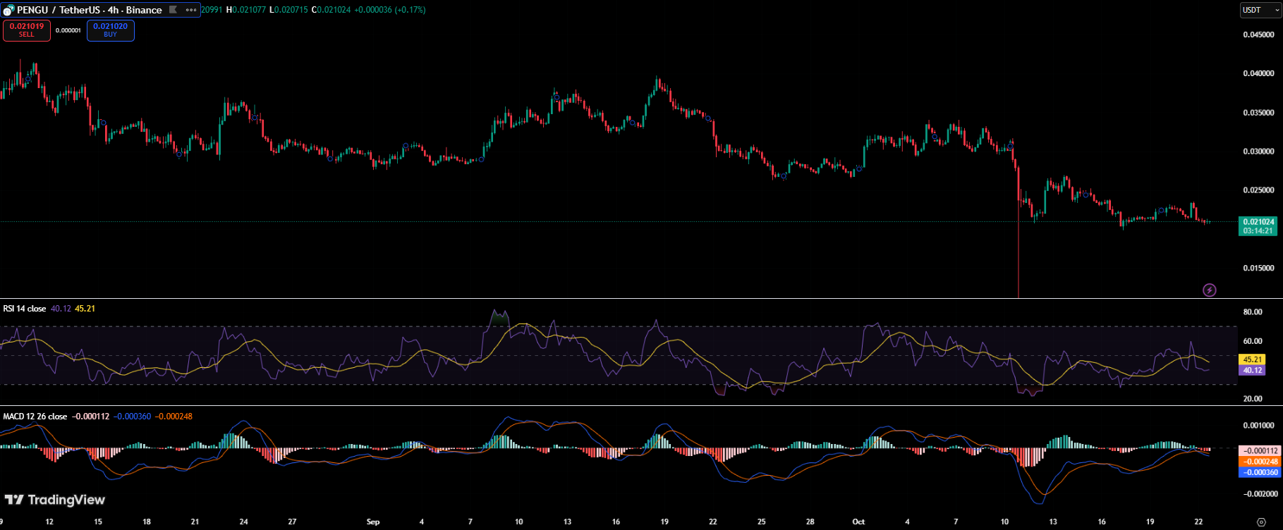Technical indicators support this potential. PENGU’s RSI currently stands near 45, hovering just below neutral territory, while the MACD lines are showing the early stages of convergence, a typical precursor to a bullish crossover. These readings imply that PENGU may be in a consolidation phase, awaiting renewed buying pressure.