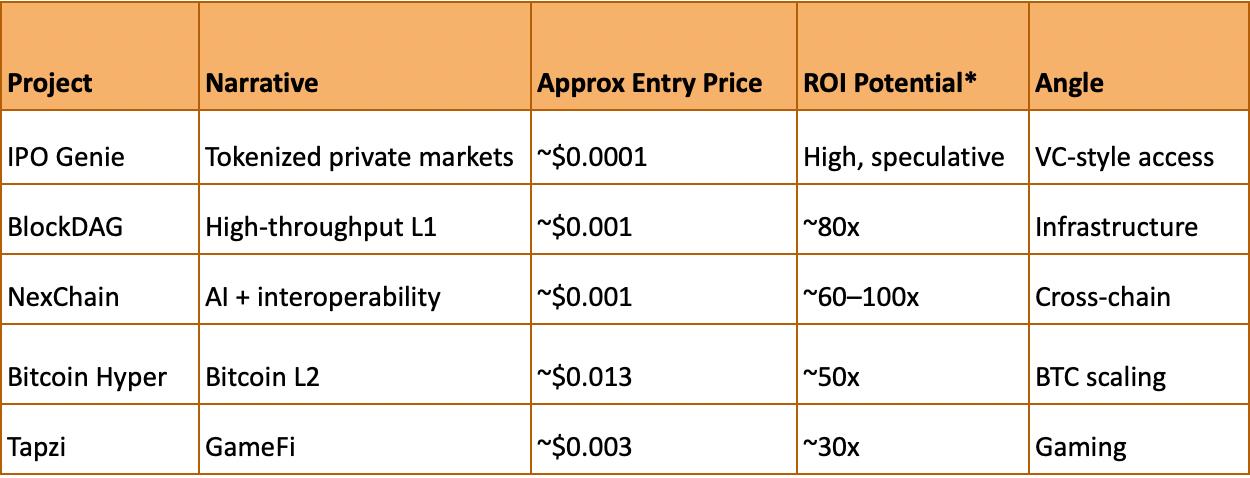 Early-stage entries can reach high multiples, but only with real utility, strong execution, and long-term adoption. IPO Genie stands out for combining private-market access, structured tokenomics, and clear demand signals. The other projects offer exposure to infrastructure, AI, scaling, and gaming.