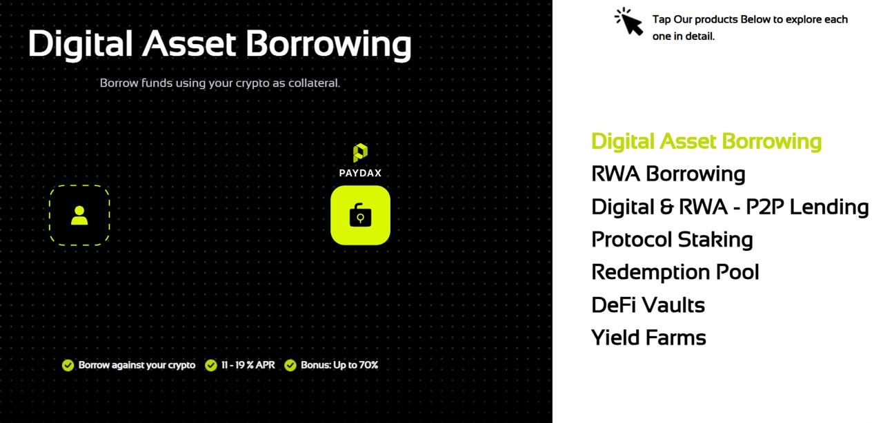 While most crypto assets are tied to speculative cycles, PayDax is building an ecosystem with real-world utility. The platform bridges decentralized finance (DeFi) with traditional asset management by allowing users to borrow, lend, and stake both digital and tokenized real-world assets (RWAs).
