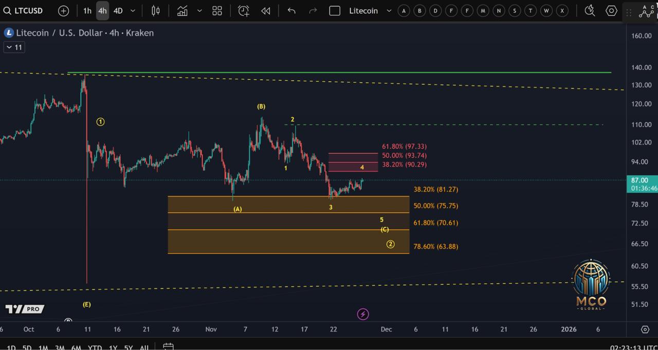 Litecoin still follows an A-B-C correction pattern. Its latest movement appears to be a wave-4 bounce. Waves 1, 2, and 3 seem complete. If this structure continues, Litecoin could drop again before forming a final upward wave. This next drop could offer better accumulation levels.
