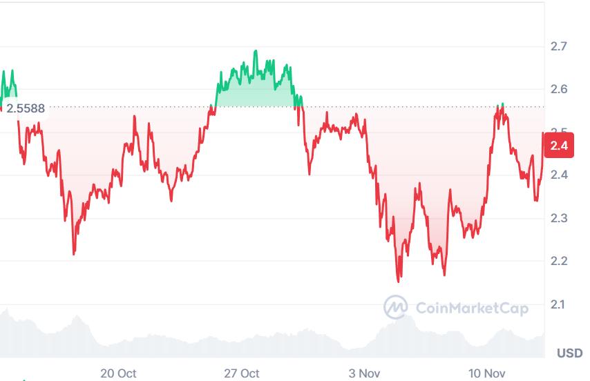 XRP traded in the $2.4 area on November 12, finally settling above its 20-day EMA, according to CoinMarketCap.