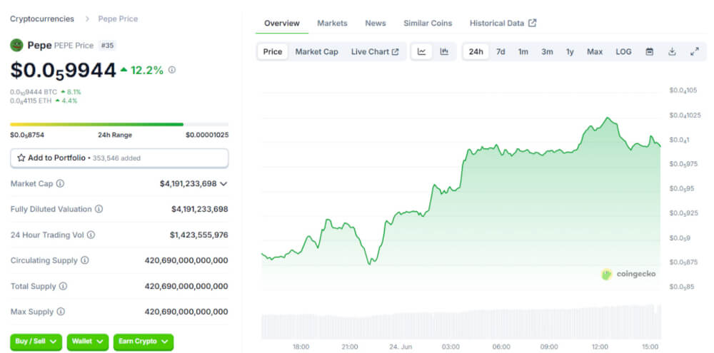 Междувременно PEPE ($PEPE) се повиши с ~12% през последните 24 часа, като се търгуваше близо до $0.000010 с обем над $1.3, въпреки че все още е под натиск от по-широката слабост на пазара.
