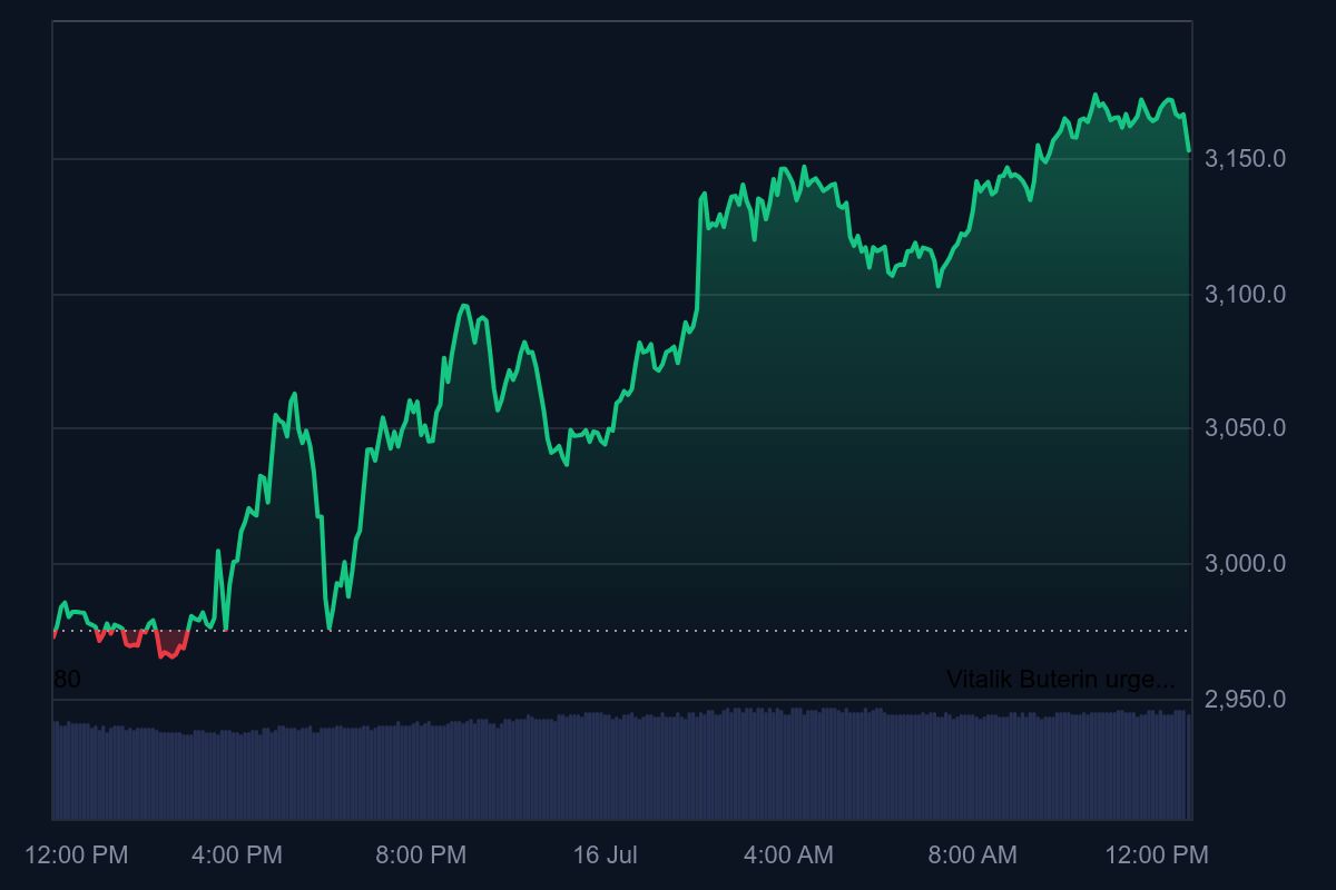 Докато ралито на BTC доминираше заглавията, ETH премина границата от $3,000 за пръв път от началото на февруари, достигайки около $3,150 – петмесечен връх.