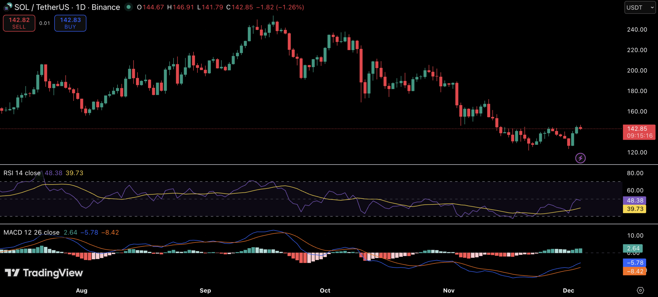 Ценовото движение на Solana започва да се стабилизира след седмици на плавни спадове, като SOL в момента се опитва да възстанови зоната $140–$145. Дневната графика показва купувачи, които се активират около подкрепата $118–$120 и задействат краткосрочен отскок. Индикаторите за инерция също се обръщат: RSI се е покачил до 48 и излиза от свръхпродадена зона, а хистограмата на MACD е преминала в зелено, което подсказва ранно изграждане на бичи инерция под повърхността.
