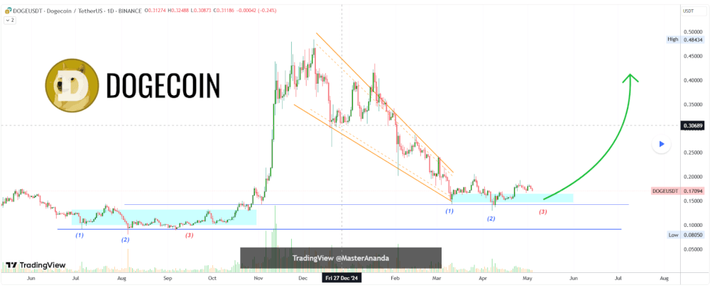 Според крипто стратега MasterAnanda, настоящата структура, която се формира на графиката на Dogecoin, следва отблизо модел, наблюдаван за последно преди скока до почти 0,50 долара в края на 2024 г. Анализът му подчертава повтаряща се формация от три вълни – ритъм на корекции, който в миналото е служил като трамплин за експлозивно движение на цените.
