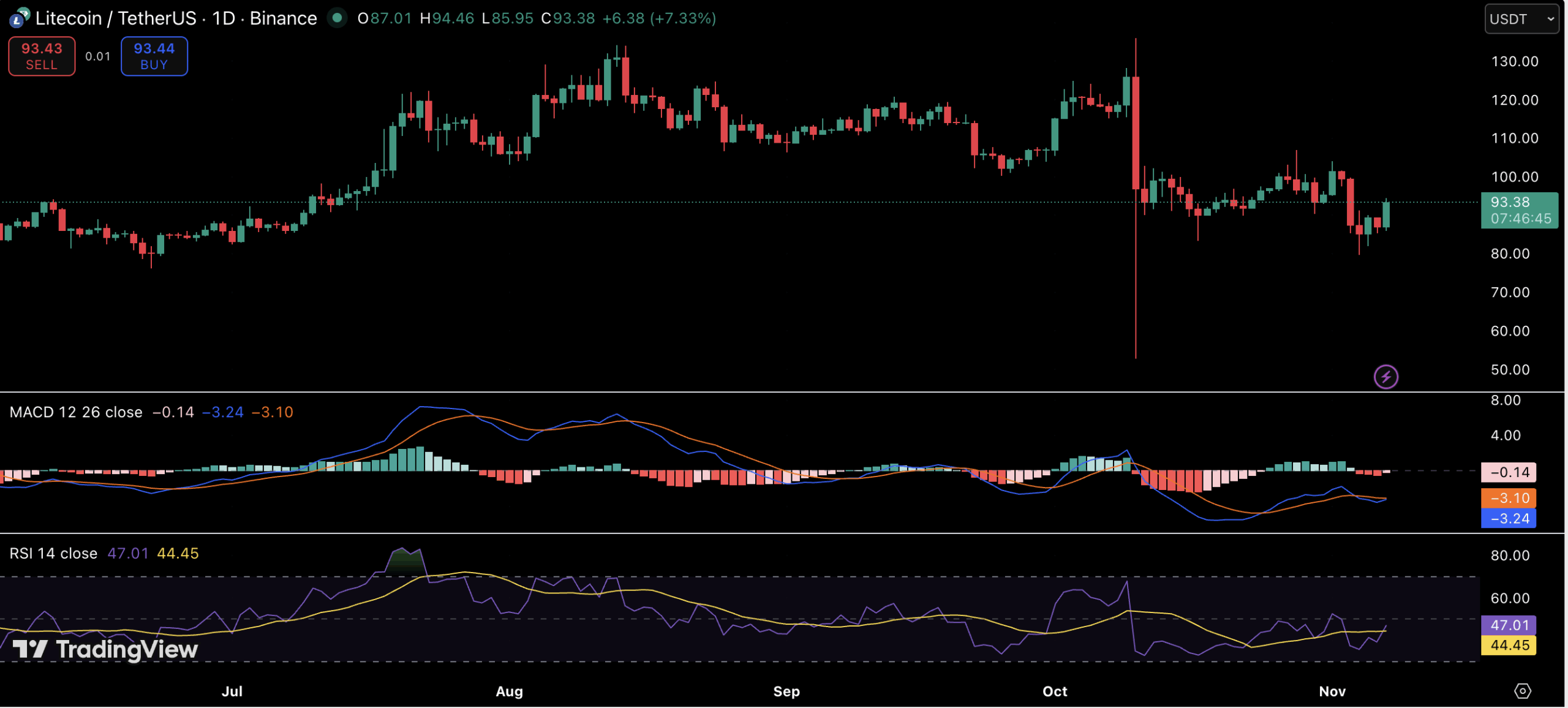 На дневната графика Лайткойн (LTC) проби краткосрочна съпротива, демонстрирайки възходящо движение, докато индикаторите започват да се подобряват. RSI се покачи до 47, което показва подобрение в нагласите, а MACD показва признаци на сближаване след продължителна низходяща фаза.
