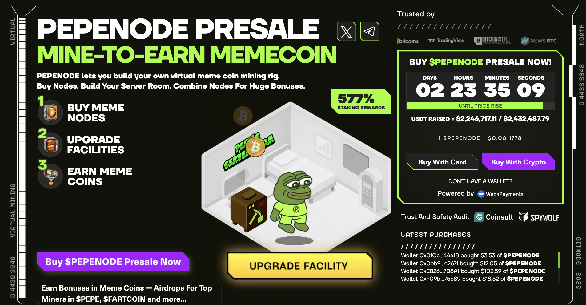 1. PEPENODE ($PEPENODE) – Mine-to-Earn меме койн с виртуални „възли“