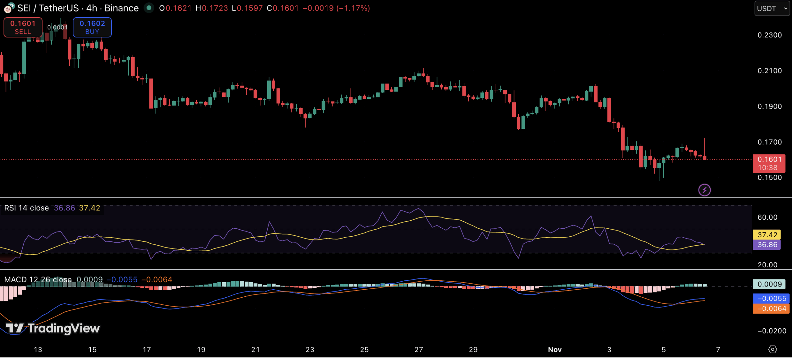 В 4-часова рамка RSI остава потиснат на 37, което подсказва отслабване на мечия натиск, докато MACD показва ранни признаци за бича пресечка. Ако SEI запази пода при $0.15, техническата картина може да подкрепи краткосрочно възстановяване.