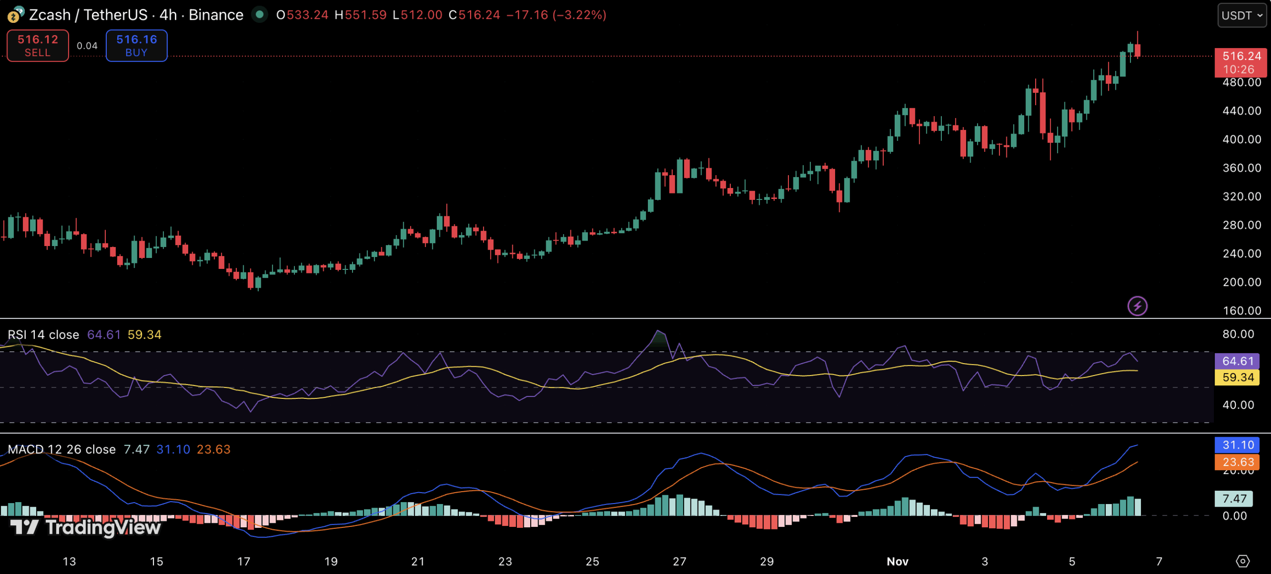 От техническа гледна точка анализаторът Ali (@ali_charts) отбеляза, че индикаторът TD Sequential „перфектно таймира Zcash през последния месец“, което подсказва, че текущият цикъл може да е близо до изтощение преди нова възходяща вълна. В 4-часов таймфрейм ZEC запазва структурата на пробив, с RSI около 64 и MACD все още в позитивна зона.