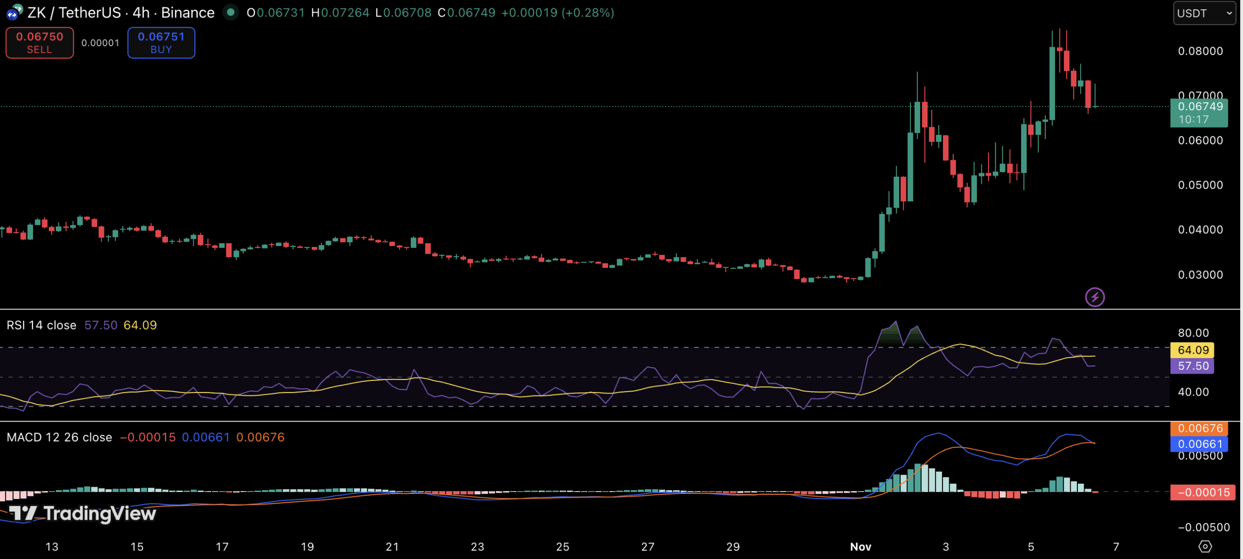 Пазарната динамика отразява нарастващото доверие. Цената на ZK се удвои за седмица (+131%), въпреки 15% дневна корекция, и към момента се търгува около $0.067. Според анализатора Ali пробив над $0.083 може да отвори път към $0.10–$0.15 – зона, видима на последната му графика в TradingView.