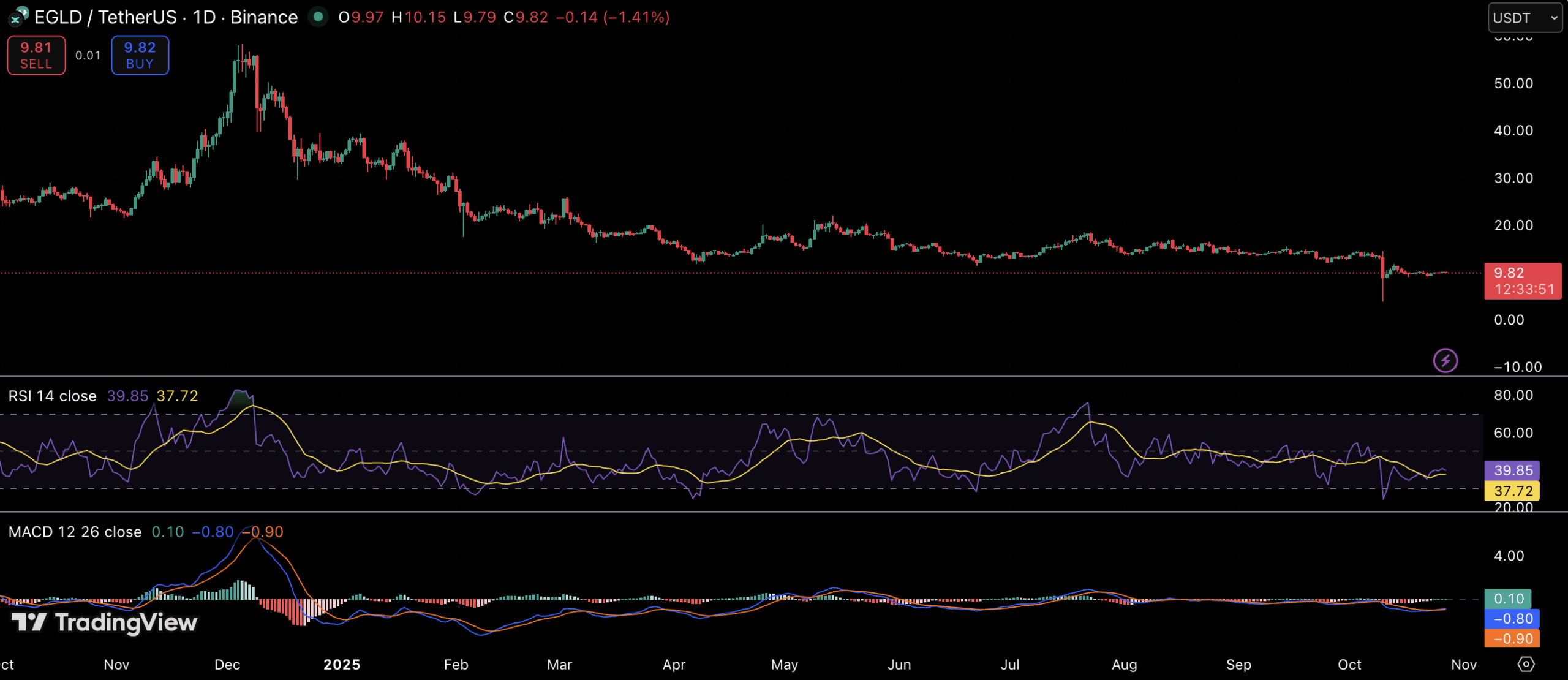 As of writing, EGLD trades around $9.82, displaying muted price action following a brief dip last week. The RSI sits near 39, showing a mildly oversold reading consistent with fading momentum. Despite occasional bounces, the price has repeatedly failed to close above its descending resistance line — a sign that sellers still dominate the market.