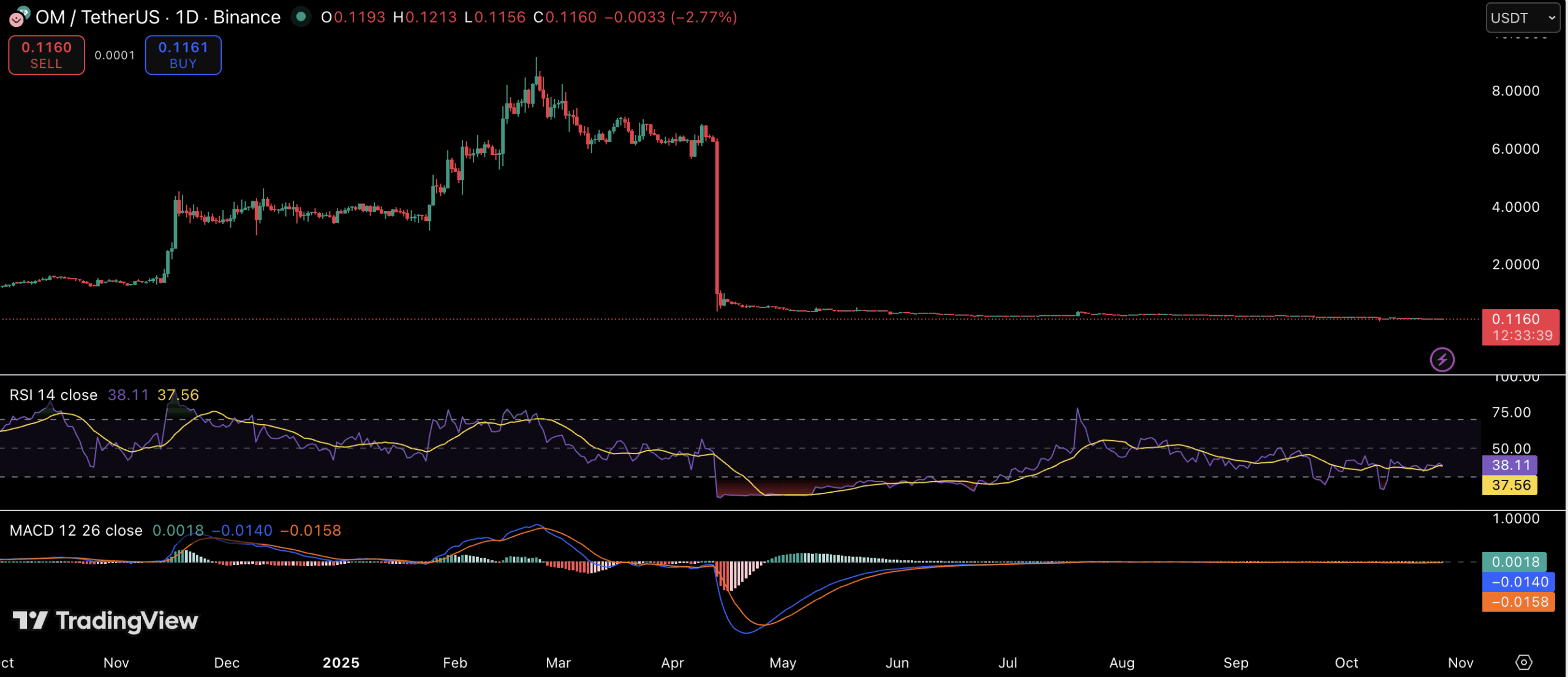 Currently priced at $0.116, OM has failed to regain significant traction, consolidating sideways within a tight range. The Relative Strength Index (RSI) hovers near 38, signaling that the asset remains in mildly bearish territory but not yet in oversold conditions. This suggests weak buying pressure with most traders remaining on the sidelines.