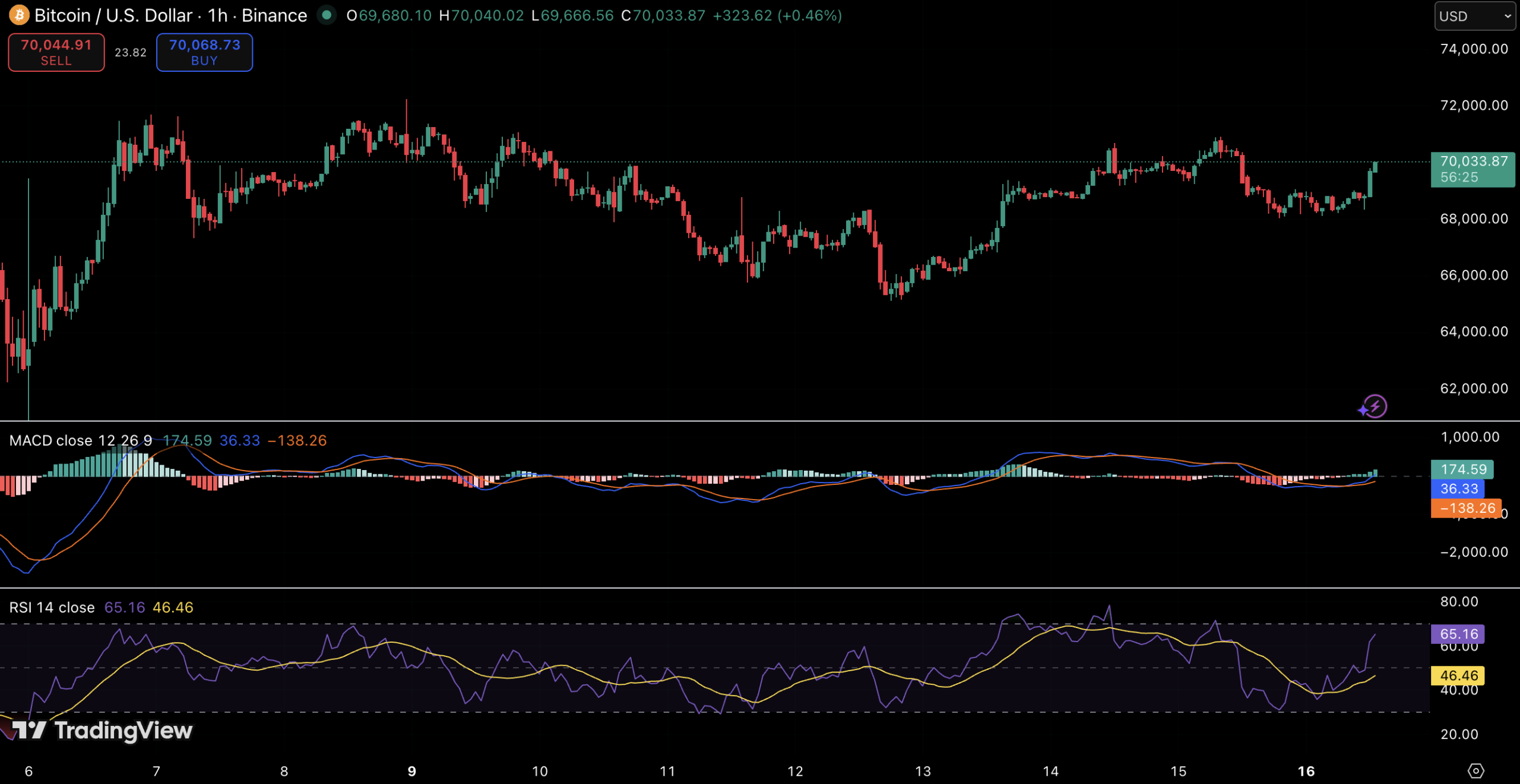 On the hourly chart, BTC pushed through the $70K mark with improving momentum, supported by a firming MACD and a rising RSI that has moved back toward the upper half of its range. The breakout follows a period of consolidation between roughly $66,000 and $69,000, where repeated dips were met with steady buying interest.