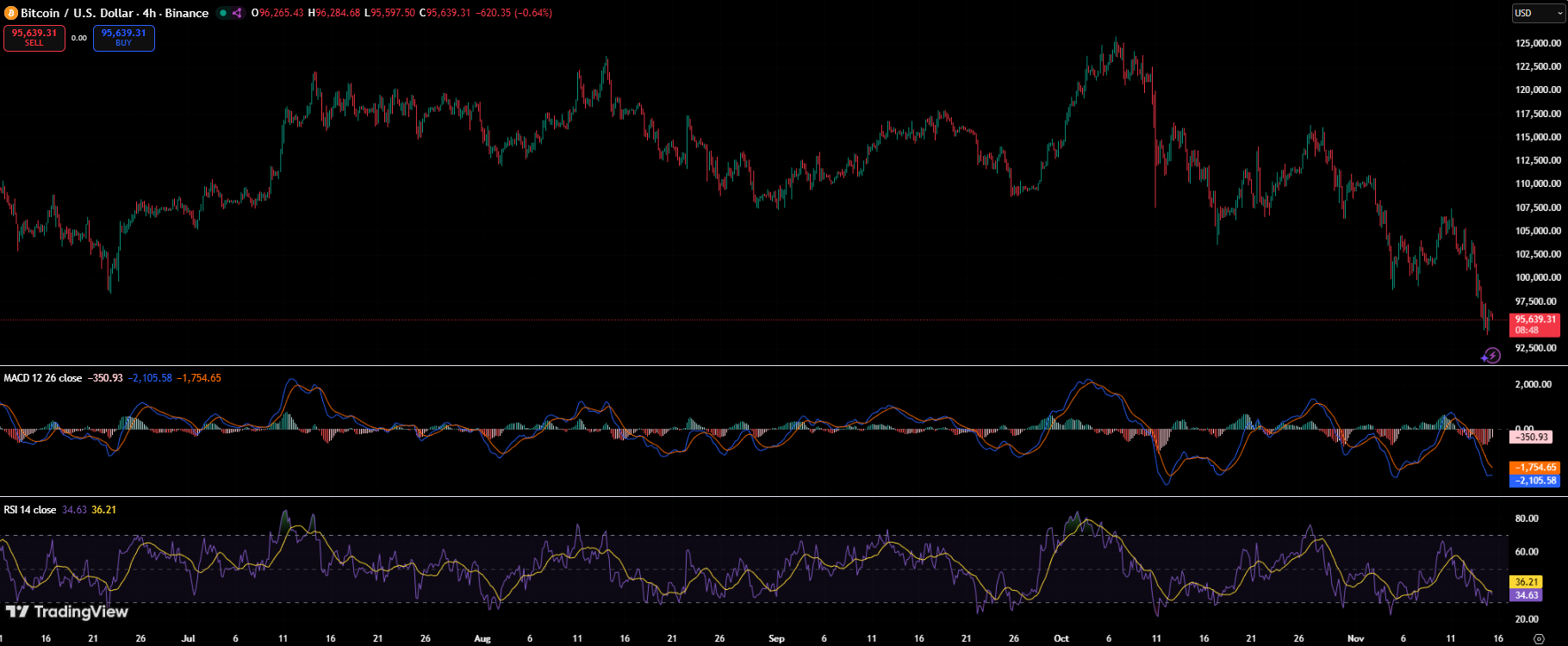 Bitcoin’s price action reflects the stress. On the 4-hour chart, BTC has slid to around $95,600, extending the steep decline that began earlier in the month.