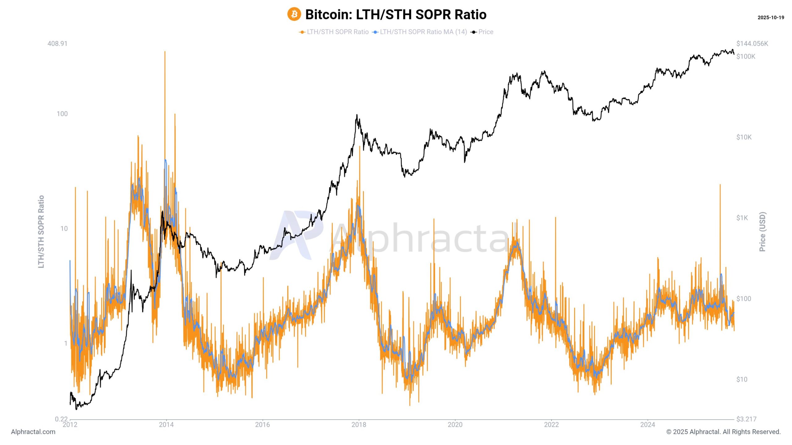 The LTH/STH SOPR Ratio – which compares profit-taking behavior between the two groups – has started to decline. This means long-term investors are reducing their selling activity, while short-term traders continue to exit positions whenever small profits appear.