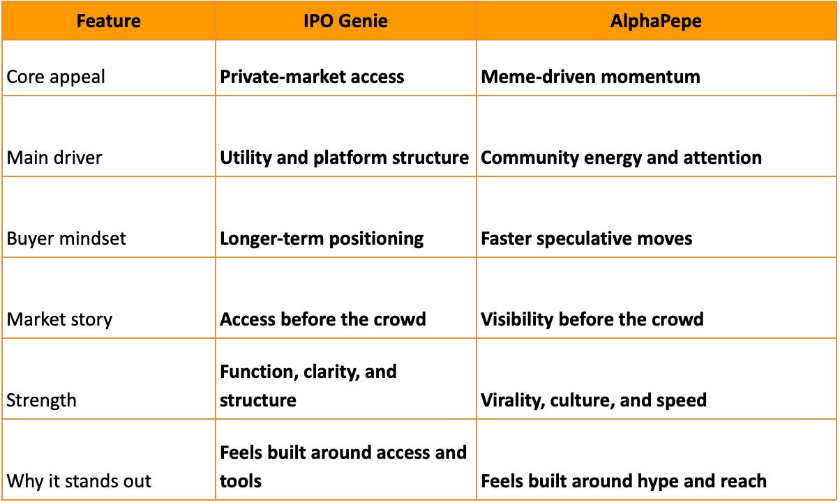 Projects like IPO Genie and AlphaPepe illustrate different approaches within this segment. IPO Genie focuses on structured access to private market opportunities, while AlphaPepe represents a more community-driven, narrative-based approach.