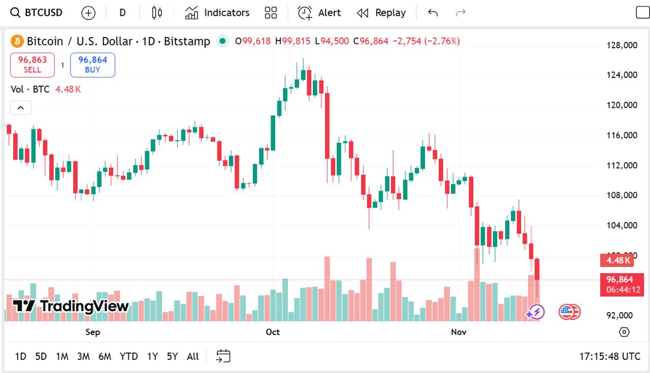 Bitcoin is currently trading at $96,863 following a significant drop of about 3.51%, with a market capitalization of about $1.93 trillion.