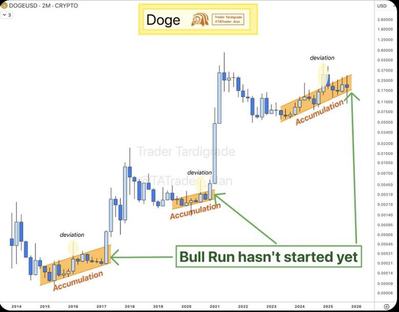 Analysts note that Dogecoin’s 2-month chart remains in the accumulation phase, signaling that the broader bull run hasn’t yet begun. They note that the price structure resembles early breakout setups from previous cycles, suggesting that momentum could soon accelerate.