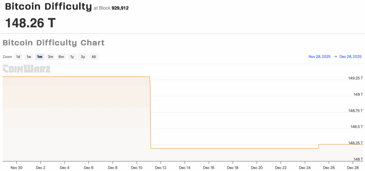 The most recent difficulty adjustment, the final one of 2025, pushed the metric to roughly 148.2 trillion, reflecting a modest increase in the computational effort required to mine new blocks. Based on current network conditions, the next scheduled adjustment in early January 2026 is expected to raise difficulty further, approaching 149 trillion.