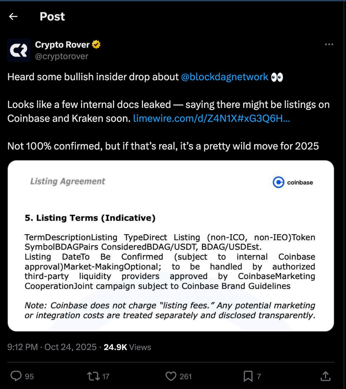 Influencer Crypto Rover has shared what he claims are leaked internal documents revealing that BlockDAG (BDAG) could soon list on Coinbase and Kraken. The files reportedly include signed agreements, trading pairs such as BDAG/USDT, and a $300K USDT liquidity pool prepared for Kraken. If accurate, these leaks could signal that BlockDAG is heading into one of the most impactful exchange debuts of 2025.