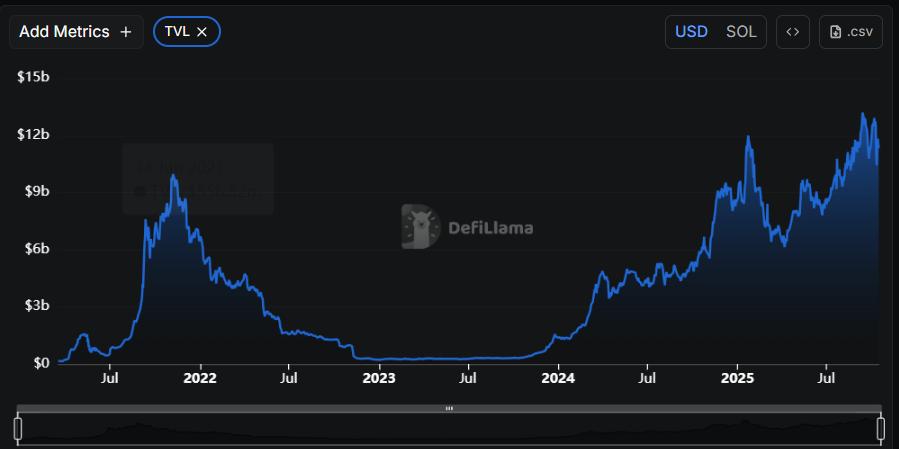 However, recent data point to a very healthy network. Notably, the chain’s total value locked in DeFi hit an all-time high above $12 billion in September, showing consistent and steady gains since late 2023.