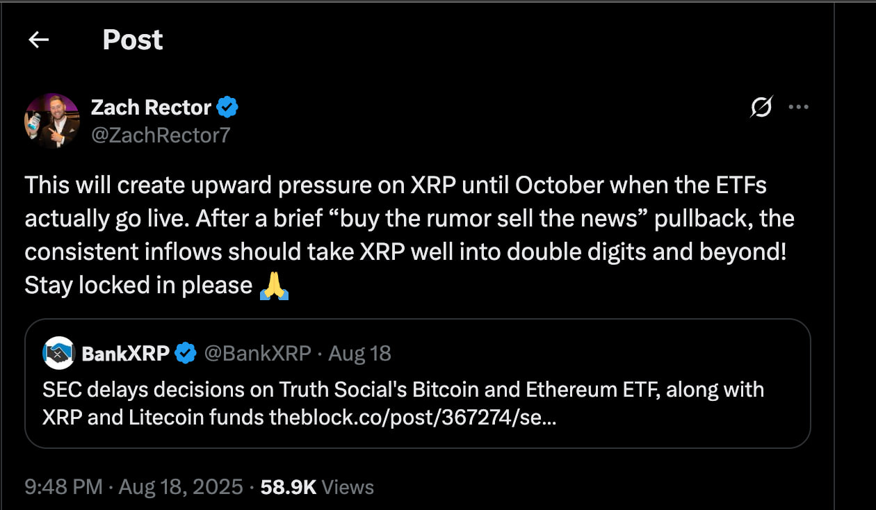 Crypto commentator Zach Rector said this delay can generate upward buying pressure in the short term. He said that anticipation often brings new inflows as investors “buy the rumor” before major announcements.