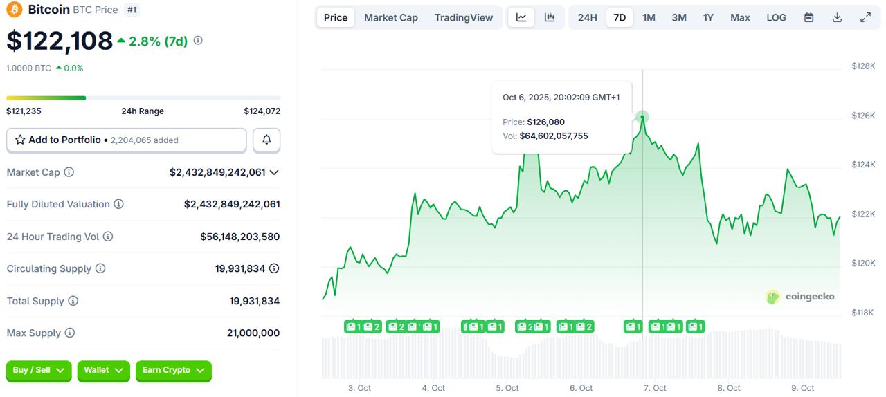 BTC reached a record $126,080 on October 5, driven by over $3.55 billion in ETF inflows, the largest single-week capital injection into crypto ETFs. The recent milestone has seen industry leaders pointing to a potential rally to a seven-figure price target by the decade’s end.