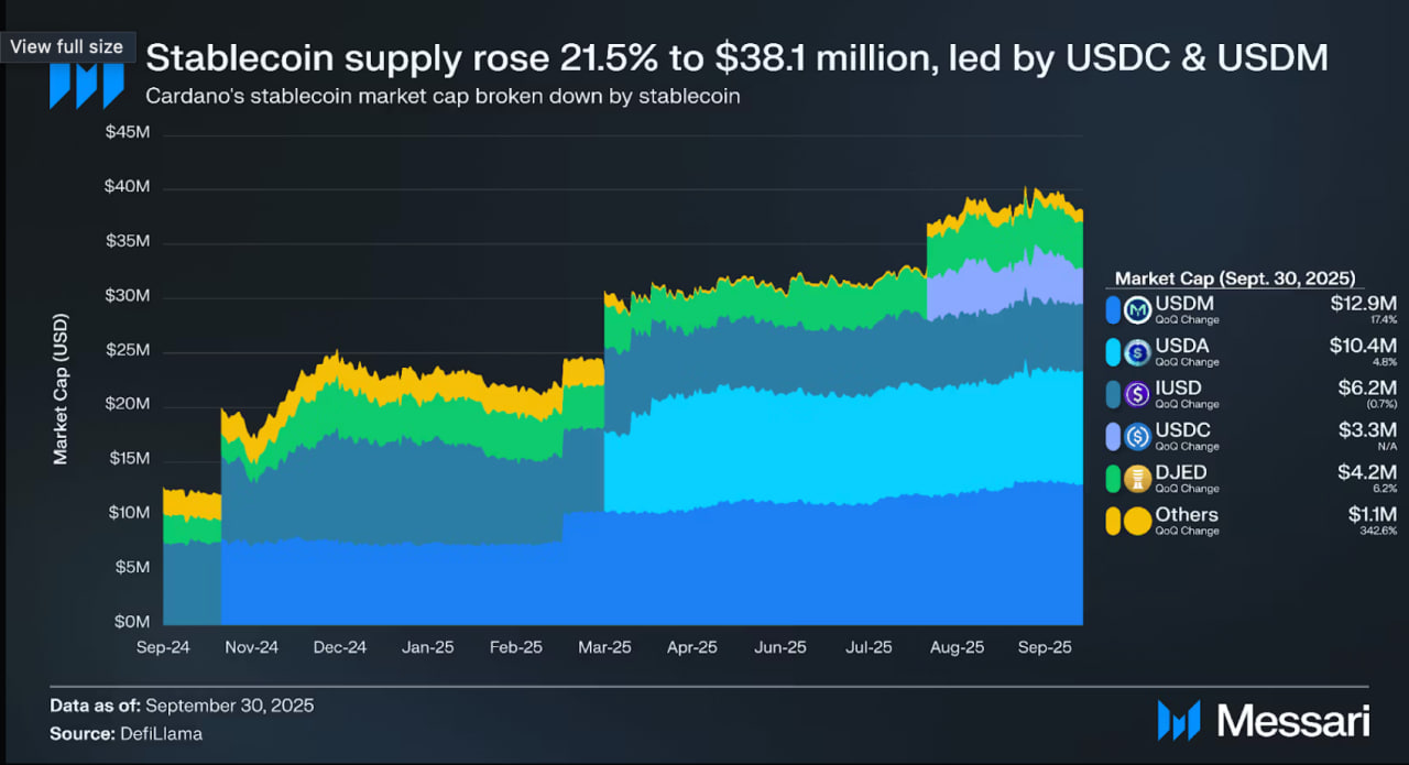 Stablecoins have become a central pillar of Cardano’s liquidity base. The total stablecoin market cap on the network rose 21.5% QoQ to $38.1 million, reflecting increased demand for reliable settlement assets.