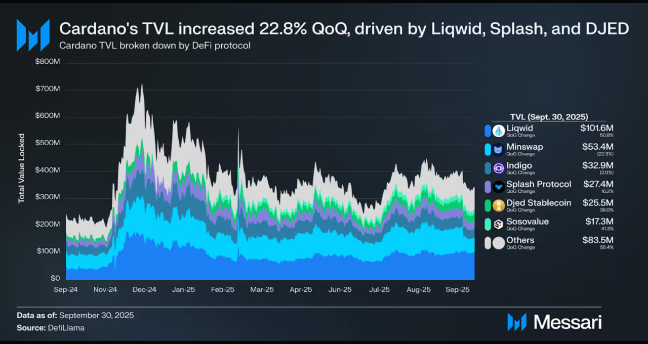 Cardano’s DeFi landscape made an impressive recovery in Q3 2025. Total value locked (TVL) climbed nearly 29% to $423.5 million, marking its strongest position since early 2022. This revival was driven by an influx of liquidity into lending platforms, stablecoin protocols, and newer decentralized exchanges.