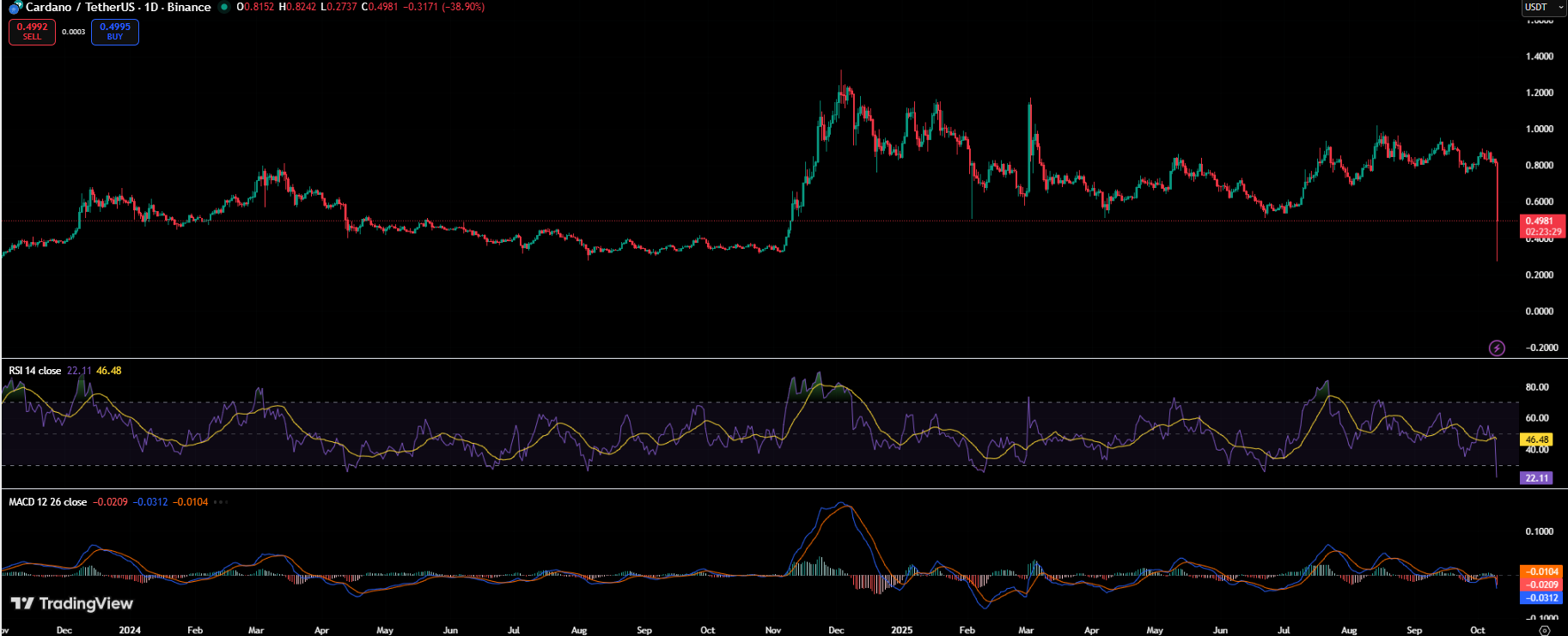 Market analysts suggest that panic liquidations and cascading stop-loss triggers played a key role in accelerating the drop. On Binance, ADA briefly touched $0.27 before quickly recovering above $0.49, mirroring the extreme volatility seen across the crypto market overnight.