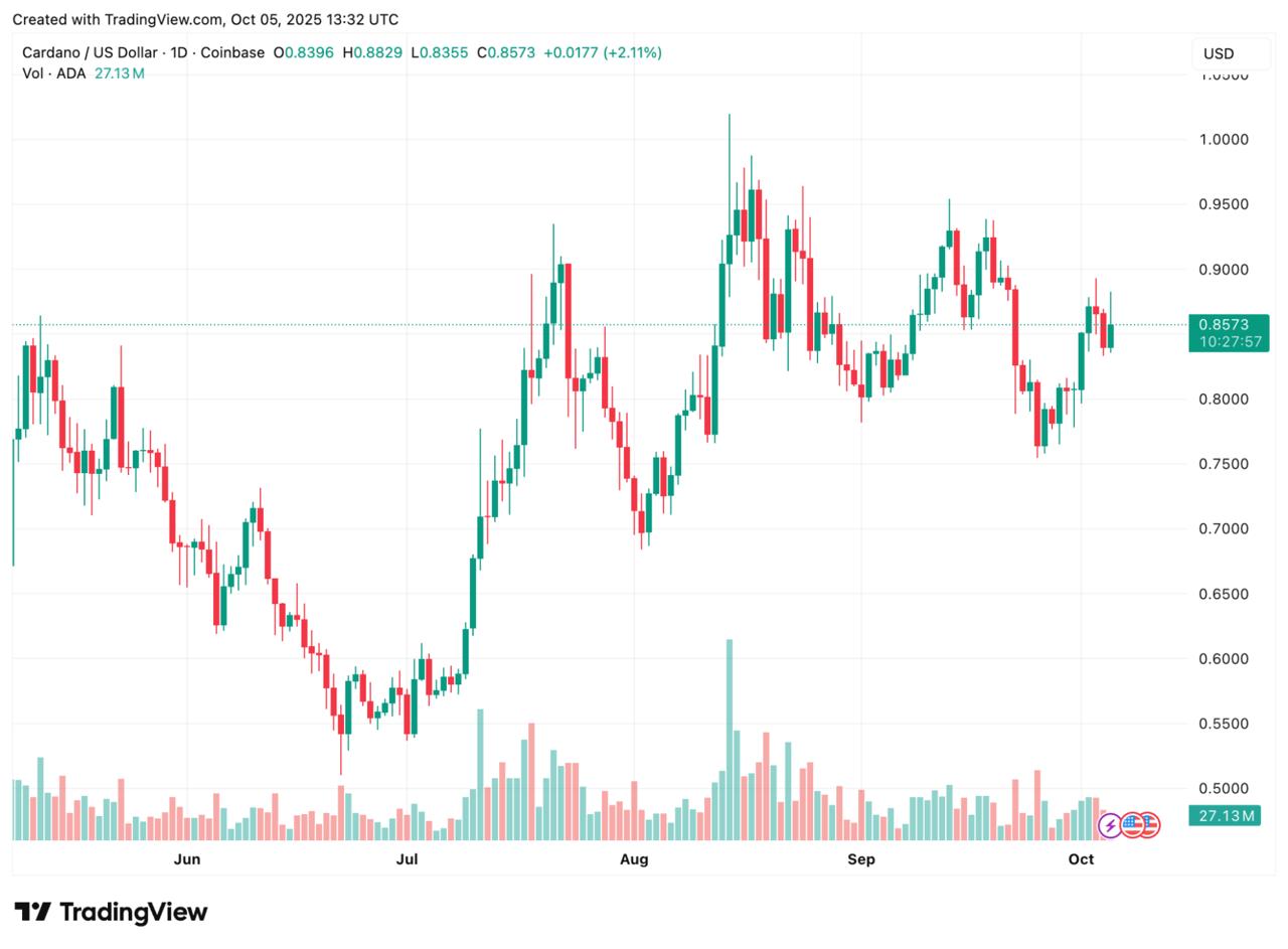Cardano is currently priced at $0.8573. Analysts and investors are also closely monitoring ADA because it trades above its 50-day moving average. As Grayscale has yet to announce its Cardano ETF ruling by the end of October 2025, Cardano may experience some price action and possibly increase to $1.02 when key resistance is cleared.