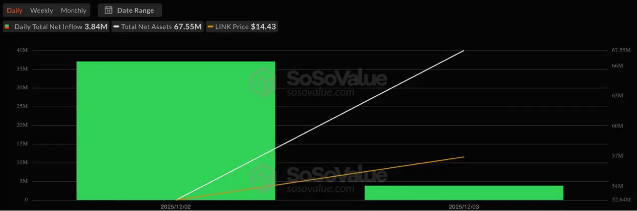 In addition, the newly launched Grayscale Chainlink Trust (GLNK) recorded strong early activity, including $37 million in inflows on its first trading day. Total assets have now climbed above $67.5 million, according to SoSoValue data.