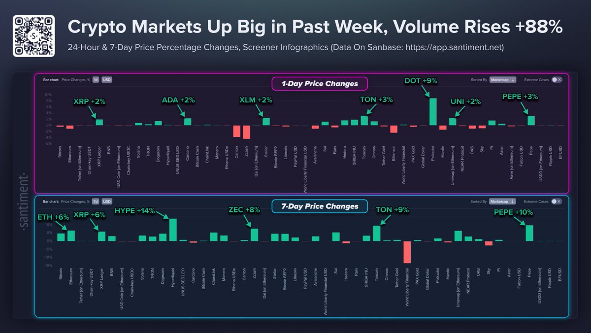The most straightforward signal comes from Santiment data: trading volume across crypto markets is up 88% this week compared to last. The market nearly doubled its activity in seven days.