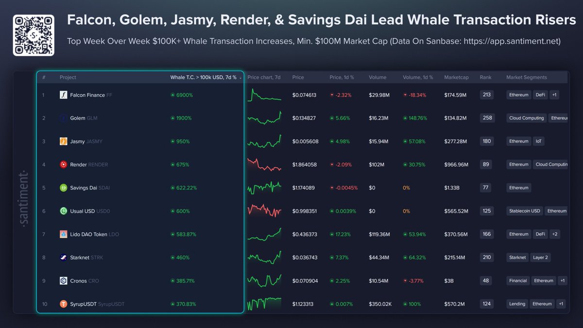 Santiment’s whale transaction data, tracking on-chain transfers of $100K or more, shows some striking week-over-week increases among projects with $100M+ market caps. Falcon Finance leads with a 6,900% surge in whale transactions. Golem is up 1,900%. JasmyCoin up 950%. Render up 675%. Lido DAO up 584%.