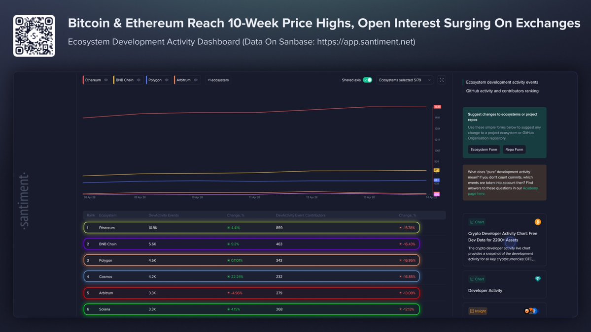The third data stream is the one most retail investors ignore entirely, which is exactly why it’s worth paying attention to. Santiment’s GitHub activity data for the past week shows Ethereum leading with 10,900 development events, up 4.4%. BNB Chain is at 5,600, up 9.2%. Cosmos had the most notable jump – 4,200 events, up 22.2%. Solana sits at 3,300, up 4.2%. Arbitrum is the only name in the group showing a decline, down 5%.