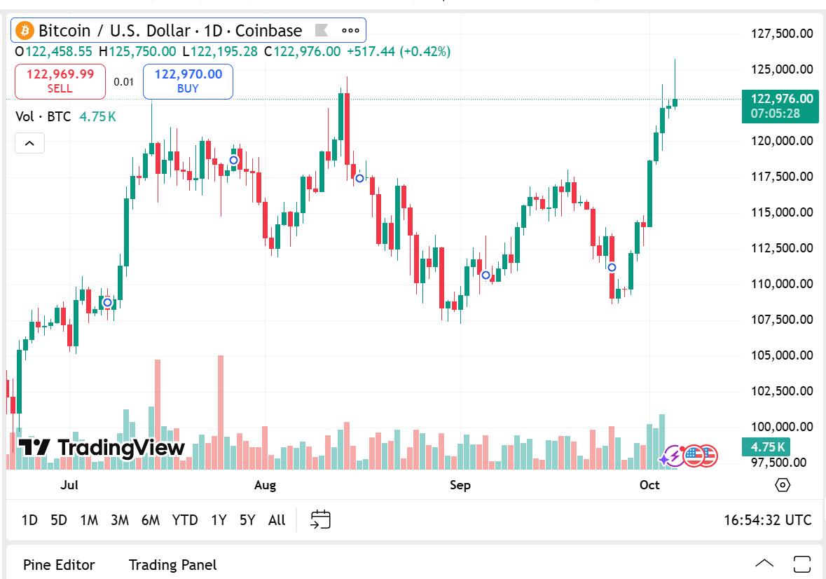 Bitcoin now costs $122,969.99, up 1.57%, which indicates steady accumulation by investors. The market capitalization rose to $2.47 trillion, and the trading volume declined 25.01% to $57.74 billion, which reflects fewer speculative trades and more long-term holding.