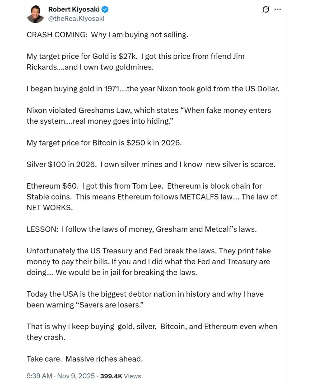 In his latest X post, Kiyosaki said that he thinks an economic crash is coming. But instead of worrying, he’s buying what he calls “real money” – Bitcoin, Ethereum, gold, and silver. His $250,000 Bitcoin target comes from believing BTC protects you when the Federal Reserve prints too much money.