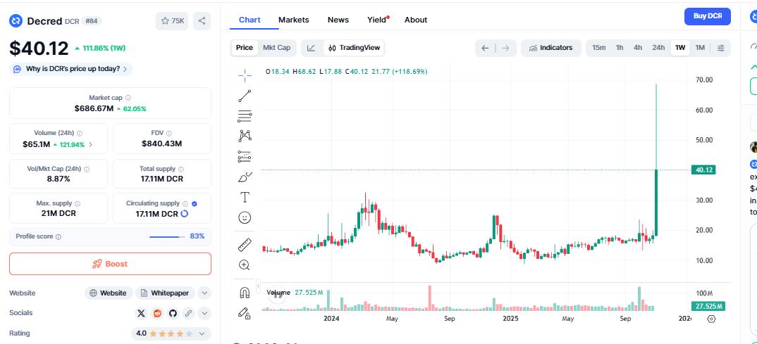 DCR went absolutely nuclear earlier this week, ripping 137% in 24 hours and touching $68 before cooling off. As of November 11, though, it cooled down to around $33.