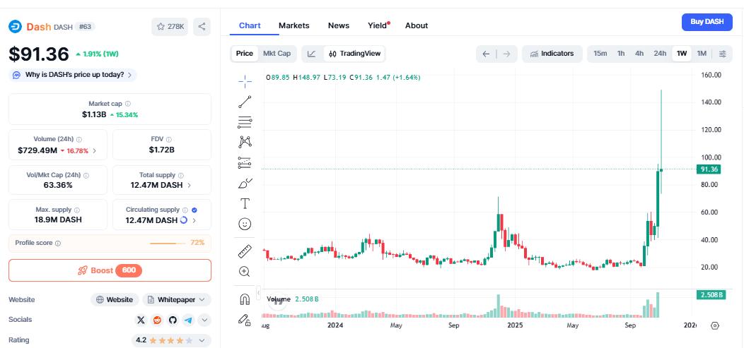 DASH rode the privacy coin wave hard, surging about 303% in the first week of November as the entire sector exploded. Zcash hit 8-year highs, and DASH followed right behind, briefly pushing the privacy coin market cap over $20.3 billion.