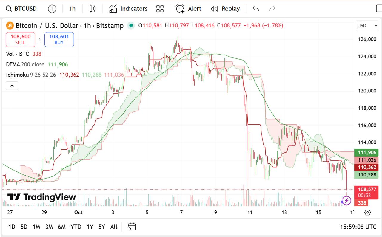 Bitcoin is currently at $107,596.63 and has fallen 3.21% in the last 24 hours, with a market cap of $2.22 trillion and trading volume of $73.39 billion — 10.35% down.