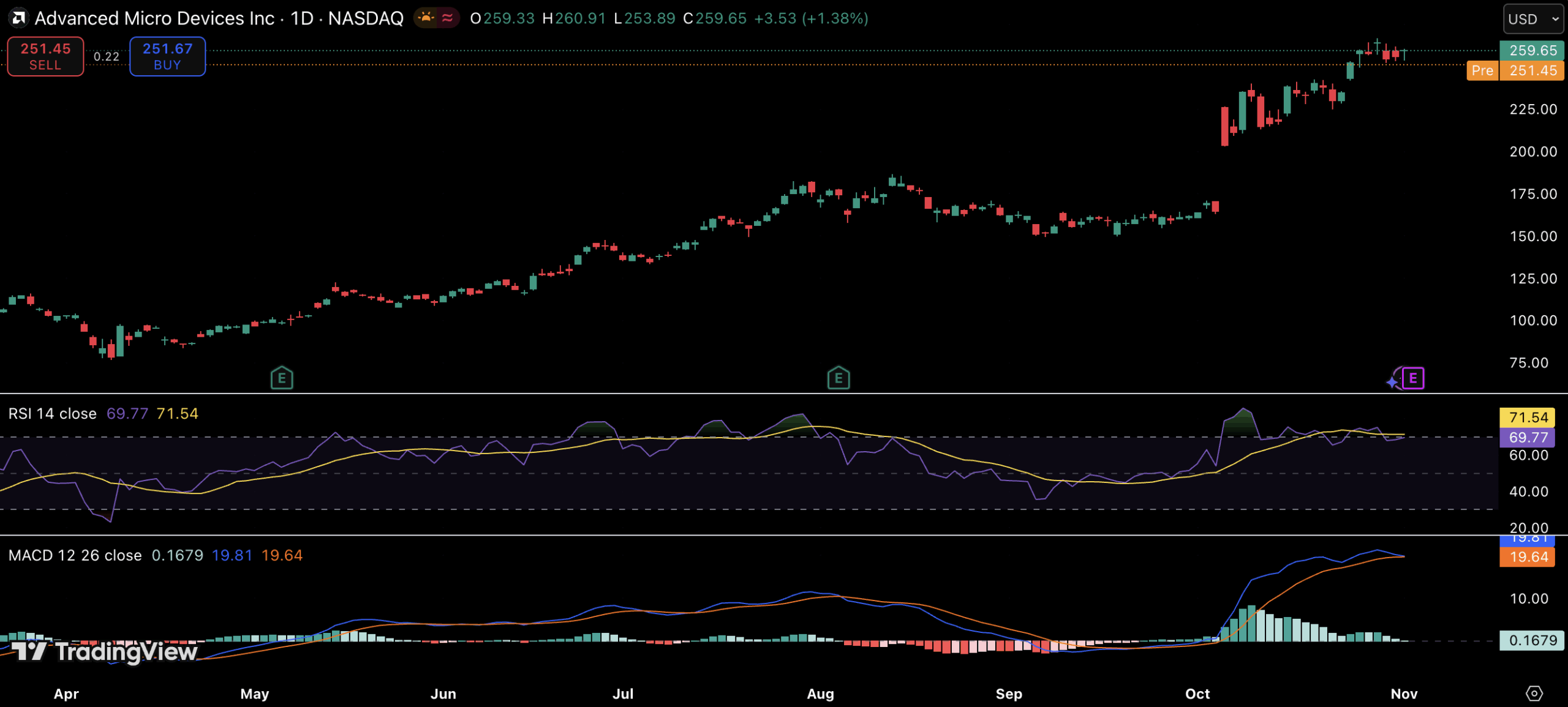 Technisch gesehen bleibt das Chart von AMD stark. Die Aktie hat seit Anfang Oktober um mehr als 30 % zugelegt, und der Relative Strength Index (RSI) bewegt sich um 70 – was auf eine Überkaufsituation hindeutet, aber auch einen starken Kaufdruck widerspiegelt. Unterdessen bleibt der MACD-Indikator positiv, was darauf hindeutet, dass die Aufwärtsdynamik in naher Zukunft anhalten könnte.
