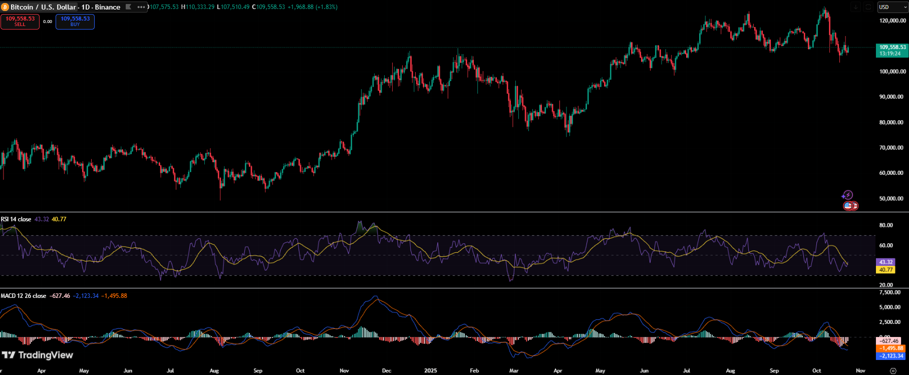 Zum Zeitpunkt der Erstellung dieses Artikels wird Bitcoin bei 109.665 USD gehandelt und verzeichnet einen leichten Tagesgewinn von 1,2 %. Die Sieben-Tage-Performance bleibt mit rund -1 % negativ, während die monatlichen Verluste bei -4 % liegen. Das tägliche Handelsvolumen ist um 27 % auf 74,78 Mrd. USD gesunken, obwohl die Marktkapitalisierung wieder auf 2,18 Billionen USD gestiegen ist, was darauf hindeutet, dass die Anleger trotz der geringen Volatilität weiterhin engagiert sind.