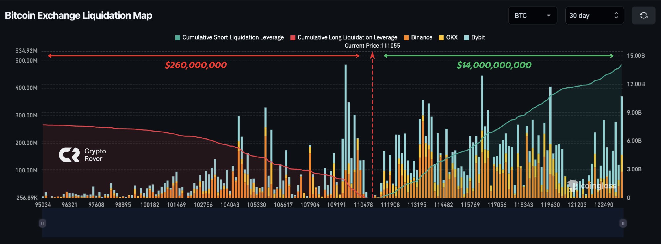 Laut Crypto Rover übersteigen die kumulierten Short-Liquidationen an den wichtigsten Börsen mittlerweile 14 Milliarden US-Dollar, während die Long-Liquidationen nur 260 Millionen US-Dollar betragen. Dieses Ungleichgewicht könnte einen starken Aufwärtstrend auslösen, wenn Bitcoin beginnt, wichtige Widerstandsniveaus zurückzuerobern.