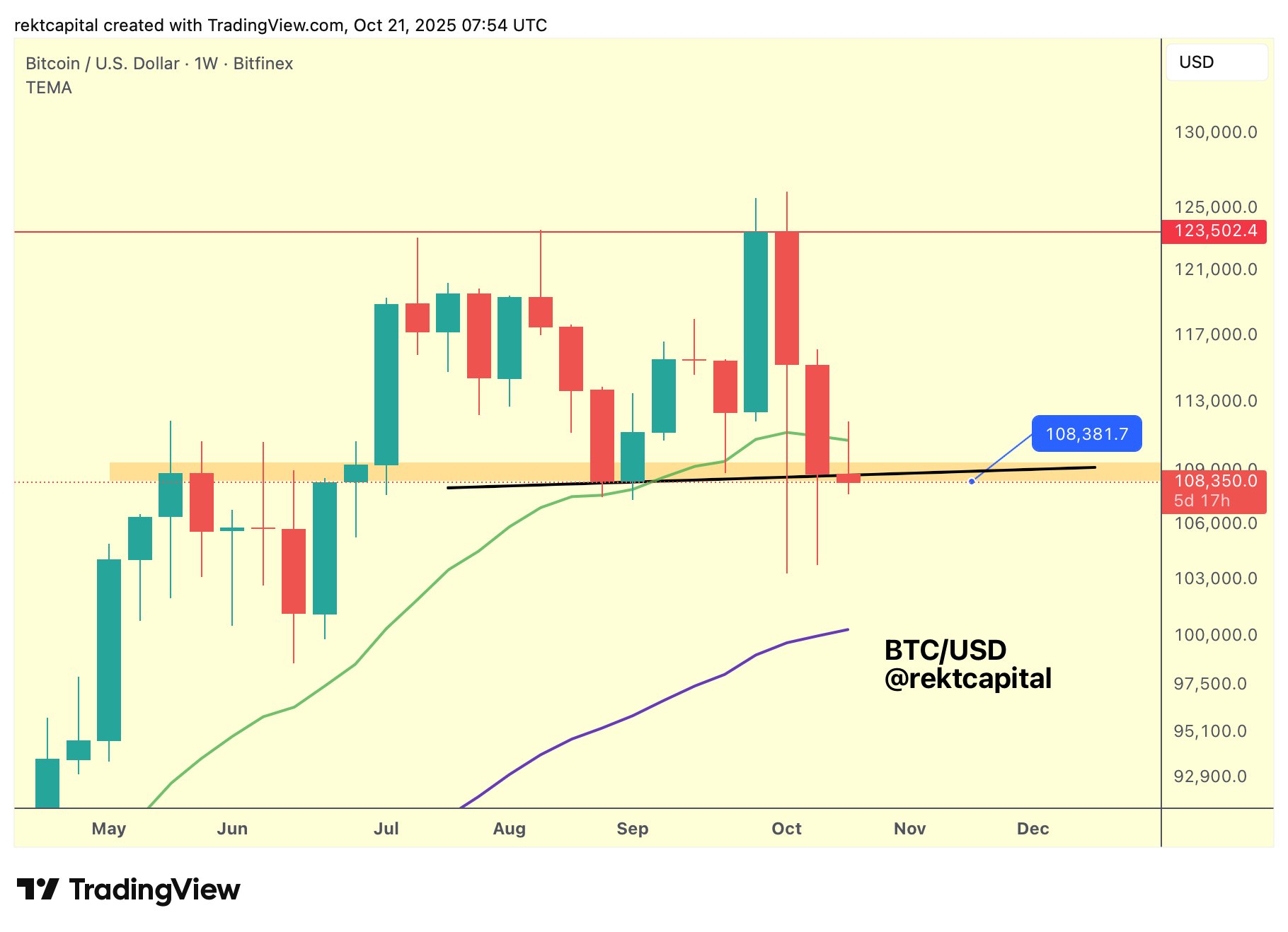 Der Marktanalyst Rekt Capital stellte fest, dass Bitcoin derzeit den exponentiellen gleitenden Durchschnitt (EMA) von 21 Wochen testet, der in früheren Zyklen als entscheidender mittelfristiger Widerstand fungierte. Der Preis bewegt sich knapp über dem historischen Nachfragebereich bei 108.000 US-Dollar, einer Region, die gehalten werden muss, damit die Bullen ihre Dynamik aufrechterhalten können.