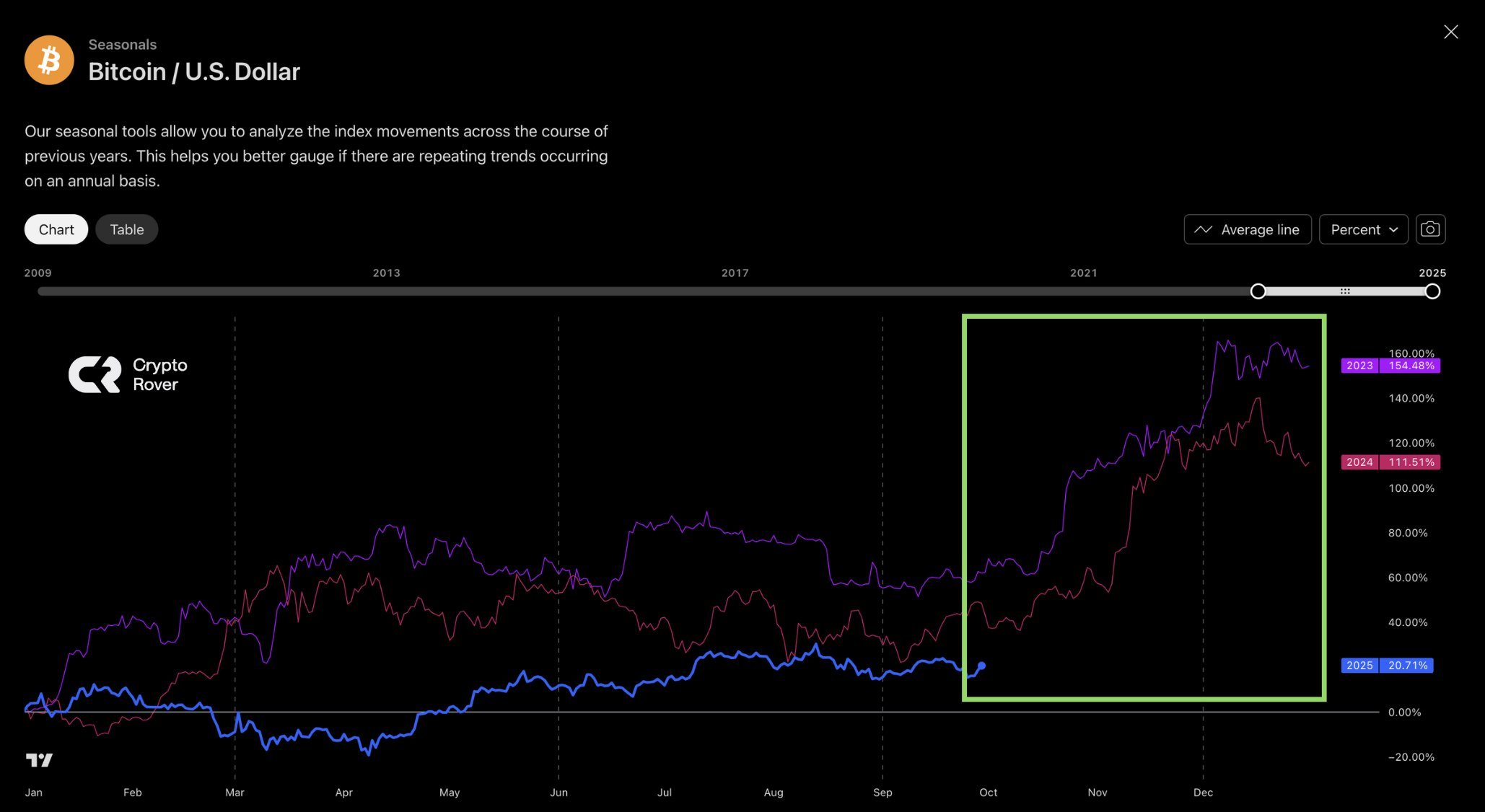 Crypto Rover, ein vielbeachteter Analyst, hob die historischen saisonalen Trends hervor, die auf eine starke Performance von Bitcoin im vierten Quartal hindeuten.