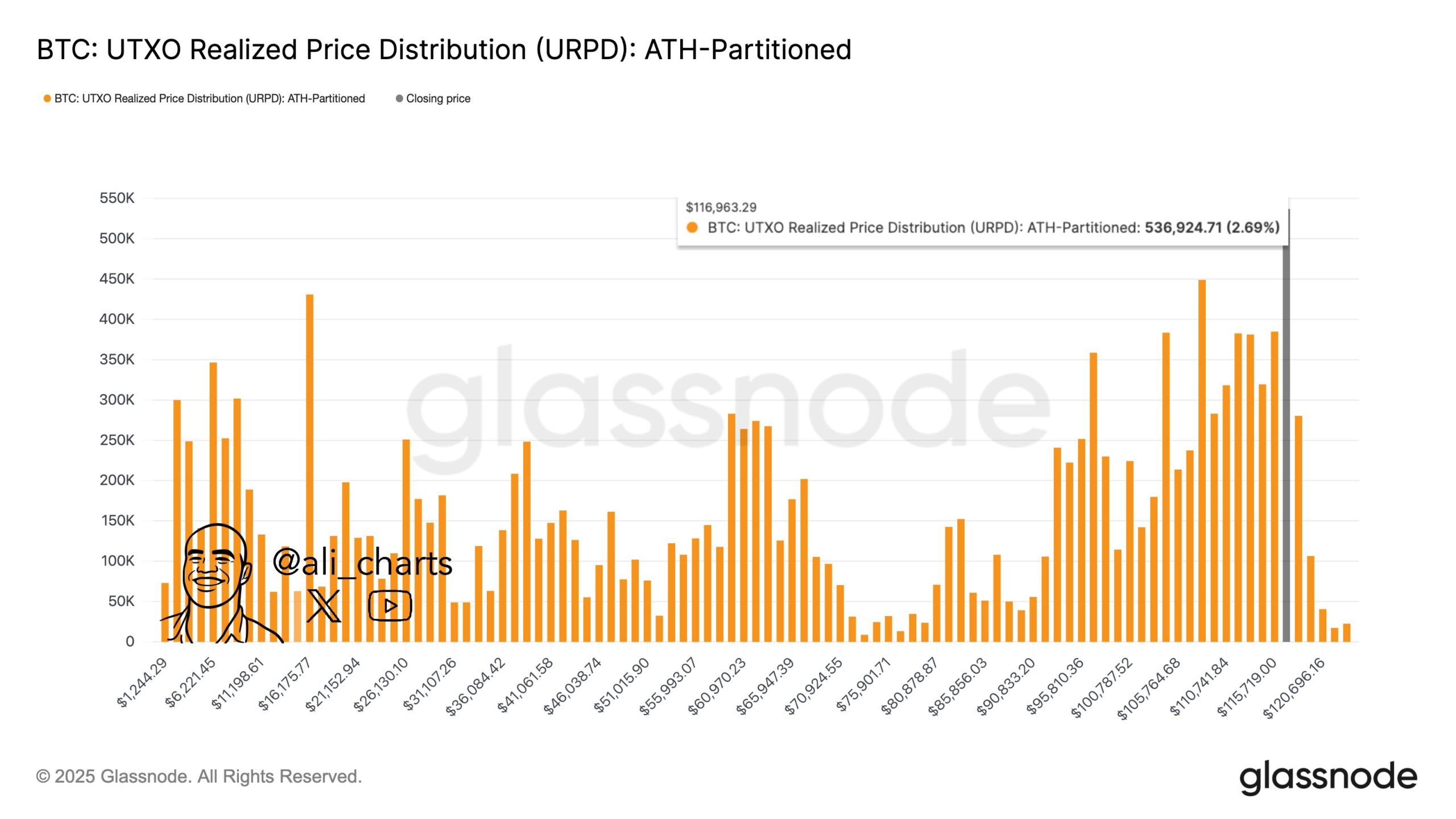 Die Preisbewegung kommt, nachdem Bitcoin eine kritische Widerstandsmarke bei 117.000 US-Dollar durchbrochen hat, die laut Daten von Glassnode als wichtige Angebotsbarriere gilt. Laut dem Marktanalysten Ali nimmt der Widerstand oberhalb dieser Marke deutlich ab, was darauf hindeutet, dass Bitcoin auf dem Weg zu neuen Allzeithochs weniger Hindernisse zu überwinden haben könnte.